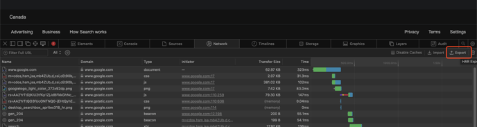 - Una vez que hayas reproducido el problema, haz clic en el botón Exportar en la pestaña Red para descargar el archivo HAR.