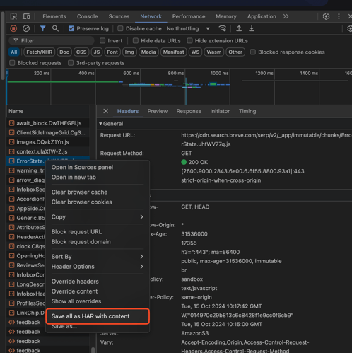 - Después de reproducir el problema, haz clic derecho en cualquier lugar de la pestaña Red y selecciona Guardar todo como HAR con contenido.