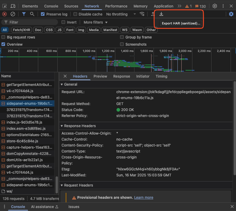 - Once the issue has been reproduced, click on the Export button in the Network tab to download the HAR file.