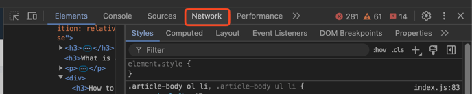- In the Developer Tools panel, click on the Network tab (you might need to enlarge the developer section for that).
